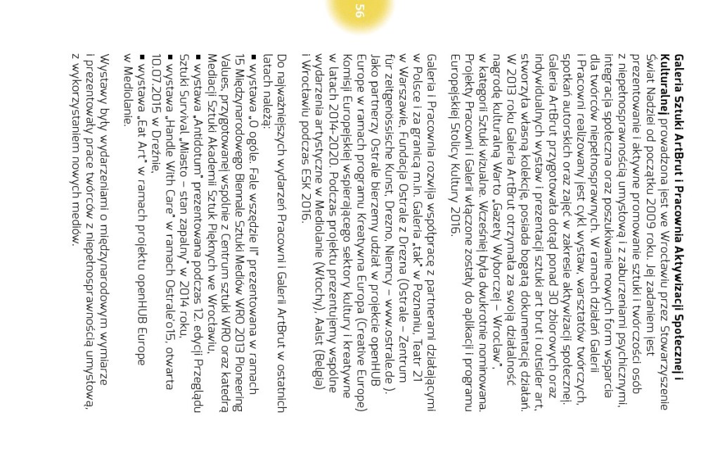 Projekt realizowany w okresie od 01.02.2015 do 31.12.2015 roku w ramach zadania publicznego : „Organizacja i prowadzenie projektu kulturalnego w 2015 roku w jednym z zakresów: projekt plastyczny, projekt muzyczny, projekt teatralny, projekt interdyscyplinarny” współfinansowanego przez GMINĘ WROCŁAW /www.wroclaw.pl/ W ramach zadania w roku 2015 realizowany jest cykl wystaw sztuki art brut i outsider art w Galerii Art Brut i Pracowni Aktywizacji Społecznej prowadzonej we Wrocławiu przez Stowarzyszenie Świat Nadziei. W ramach wystaw prezentowane są różne dziedziny sztuki, m.in. grafika, malarstwo, kolaż, fotografia, sztuka multimedialna, obiekty artystyczne i inne. W ramach każdej wystawy organizowane są wydarzenia towarzyszące jak spotkania autorskie, oprowadzenia kuratorskie czy wykłady. Istotnym elementem jest udział samych twórców w procesie produkcji wystaw. Działania opierają się na współpracy twórców niepełnosprawnychoraz osób ze środowisk artystycznych (artystów i kuratorów), instytucji kultury i sztuki oraz innych zaproszonych gości projektu. Zadanie jest podstawą dla stworzenia regularnego programu Galerii Artbrut w 2015 roku i opiera się na naszych doświadczeniach z lat poprzednich oraz obserwacji tego typu wydarzeń w zagranicznych instytucjach o podobnym charakterze, m.in. w Muzeum Sztuki ArtBrut w Lozannie, czy pracowni Artilabo w Bredzie, które prezentują sztukę osób niepełnosprawnych. Galeria ArtBrut w roku 2015 kontynuuje swoją dotychczasową linię działalności, prezentując zarówno twórców działających we Wrocławiu jak i unikalnych artystów sztuki art brut i outsider art z różnych miejsc w Polsce. W ramach Cyklu przygotowane są następujące 4 wystawy: Wstawanr1.WystawaIndywidualnaDanielaStachowskiego. Daniel Stachowski to urodzony w 1983, twórca związany z pracownią arteterapii Stowarzyszenia „Ostoja” przy CTR we Wrocławiu. Twórca wykonuje setki prac często prowokujących i obscenicznych, komentuje w nich ostro rzeczywistość, krytykuje polityków i przemoc. Bardzo często wraca do lat stanu wojennego, w tym czasie umieszcza akcję. Jego prace często budzą w widzach oburzenie. Poza obrazami wykonuje też formy przestrzenne – zawsze te same bryły – bunkry, wieże, czołgi. Opieka kuratorska wystawy : Małgorzata Rel. Wystawa 2. Wystawa indywidualna Henryka Żarskiego Henryk Żarski urodzony w 1944 roku, to jeden z najbardziej znanych w Polsce i na świecie twórców sztuki art brut i outsider art.Idea wystawy skonstruowana jest wokół głównych przedstawień obrazów Henryk Żarskiego, motywu postaci ludzkiej i towarzyszącej jej postaci zwierzęcia, czasami zastępowanej przedstawieniami środków lokomocji, jak powózka, rowery, motocykle czy samochody. Na wystawie można będzie zobaczyć najnowsze prace artysty, powstałe na płótnach oraz jedne z pierwszych prac wykonane na papierze. Artysta związany jest z poznańską galerią „tak”. Opieka kuratorska wystawy Malgorzata Szaefer Wystawa3.WystawazbiorowaCecyliSobolewskiejiMartyStańczyk CecyliaSobolewskazwiązana jest z pracownią rysunku, malarstwa, rzeźby i projektowania„Atelier” Teresy Starzec oraz z Teatrem 21 w Warszawie. Ulubioną formą jej prac są komiksy i rysunki do wymyślonych przez nią historii. Prace plastyczne Celi Sobolewskiej były eksponowane kilka razy w latach 2003-2014 w ośrodkach kultury oraz innych instytucjach: w Poleskim Domu Kultury w Łodzi ; w Instytucie Mikołowskim im. Rafała Wojaczka w Mikołowie; w szkole plastycznej „Atelier” w Warszawie na Foksal 11 w 2010 oraz 2014 r.; w Muzeum Okręgowym w Sandomierzu na Zamku, listopad 2014. W maju ubiegłego roku twórczyni zdobyła drugą nagrodę za plakat na temat Powstania Warszawskiego w konkursie dla młodzieży ogłoszonym przez Muzeum Okręgowe. MartaStańczyk . Absolwentka Społecznej Szkoły Specjalnej „DAĆ SZANSE”, obecnie uczestniczka WTZ i aktorka TEATRU 21 w Warszawie. Brała udział we wszystkich spektaklach teatru. Jest autystką wysoko funkcjonującą, obdarzoną talentem plastycznym i muzycznym. Jej twórczość to: rysunki, pisane historyjki uzupelniane ilustracjami, malartwo, prace z gliny. Jej prace pokazywane były na licznych wystawach zbiorowych . W 2005r uczestniczyła w Ogólnopolskiej Wystawie Sztuki Nieprofesjonalnej w Muzeum Etnograficznym w Warszawie. Jej „historyjkom” poświęcony był także Biuletyn Klubu Forum Wydawany przez Fundację Synapsis z 2006r. Praca Marty została również umieszczona w Jubileuszowym Kalendarzu STO na 2012/13 rok. Opieka kuratorska wystawy Justyna Warecka. Wystawanr4.WystawatwórcówzwiązanychzwrocławskąGaleriąArtbrut–PozaTabuII Wystawa jest inspirowana zebranymi doświadczeniami z pracy z grupą twórców związanych z Galerią ArtBrut. Punktem wyjścia są doświadczenia, materiały i prezentowane prace w 2014 roku podczas festiwalu Survival i wystawy Poza Tabu I. W założeniu wystawa będzie wynikiem kontynuacji działań twórczych, spotkań warsztatowych i analiz badawczych realizowanych w GaleriiArtBrut w 2015 roku, krążących wokół problematyki tabu w życiu i sztuce związanego z cielesnością, sensualnością, uczuciami. Zadaniem wystawy będzie także przełamywanie stereotypów na temat twórczości osób niepełnosprawnych i zaburzeniami psychicznymi. Istotnym elementem wystawy będzie praca nad udostępnieniem jej elementów zarówno w wymiaże artystycznym jak i na poziomie technicznym dla odbiorców ze specjalnymi potrzebami w tym osób niewidzących, niedowidzących i niedosłyszących oraz niesłyszących. Opieka kuratorska wystawy Jacek Zachodny.